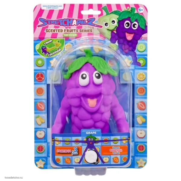 Фигурка-тянучка от бренда Stretchapalz теперь в виде полезных и вкусных фруктов и ягод! Игрушка виноград размером 14 см! С новой веселой серией можно не только играть, но и изучить виды ягод и фруктов, ведь новые игрушки пахнут и выглядят так же вкусно как и настоящие съедобные версии! Смотри не проголодайся! Яркий дизайн, крутой вид и тянучка - то что нужно для эпичных сражений! Тяните, сжимайте, кидайте и играйте с фигуркой-игрушкой от бренда Stretchapalz, ее можно мять как угодно, после чего она возвращается в исходную форму. Игрушка Stretchepalz имеет яркий цвет, ее очень просто и удобно чистить. Эти забавные фигурки станут для вас отличной антистресс игрушкой. Безопасный и нетоксичный латексный материал, не вредит вашей коже . Большой ассортимент позволит вам выбрать именно своего героя, а уникальный дизайн сделает игрушку горячо любимой для каждого!