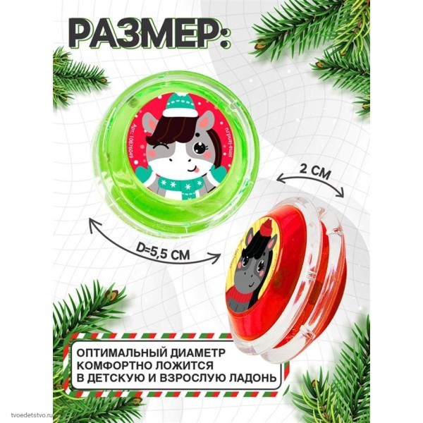 Игрушка-йо-йо с новогодним символом года «Лошадь» — компактное развлечение для детей и взрослых. Классический механизм помогает расслабиться и отвлечься в любой обстановке: дома, на прогулке, в дороге. Яркие рисунки с персонажами придают игре праздничное настроение, а диаметр 5,5 см удобно ложится в ладонь.