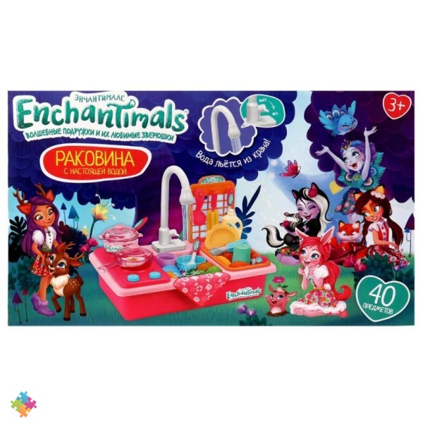 Игровой набор "Enchantimals. Раковина с настоящей водой" ТМ "Играем вместе" станет замечательным подарком для маленьких поклонниц мультсериала про юных волшебниц:-вода льется из крана-переключатель "Вкл./Выкл." -яркое оформление с любимыми героями-40 предметов в комплекте. Этот игровой набор позволит малышке почувствовать себя настоящей хозяйкой, так как раковина очень реалистичная и функциональная. Кроме того, мыть посуду вместе с персонажами любимого мультсериала будет намного веселее! Ребенок сможет придумать множество веселых игр, в которых с удовольствием примут участие родители и любимые игрушки. Игра с набором ТМ "Играем вместе" развивает:-внимание-моторику рук-координацию движений-фантазию-память.