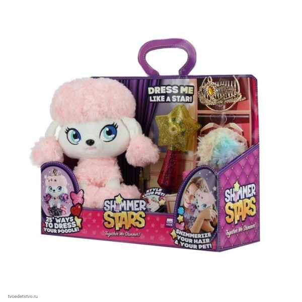 Shimmer Stars Плюшевый пудель 20 см Плюшевый пудель Shimmer Stars порадует вас большим количеством модных образов, которые можно менять сколько угодно! В наборе 16 стильных аксессуаров, с помощью которых можно менять цвет лапок, хвостика, ушек и накидки. Также в комплекте есть диадема и шиммерайзер, с помощью которого можно украшать пуделя блестками, их в наборе более 200 штук! Не забудь украсить и себя: блестки держатся на волосах и одежде, не оставляют зацепок и их можно использовать повторно! Shimmer Stars - вместе мы сияем!