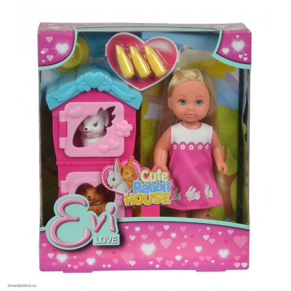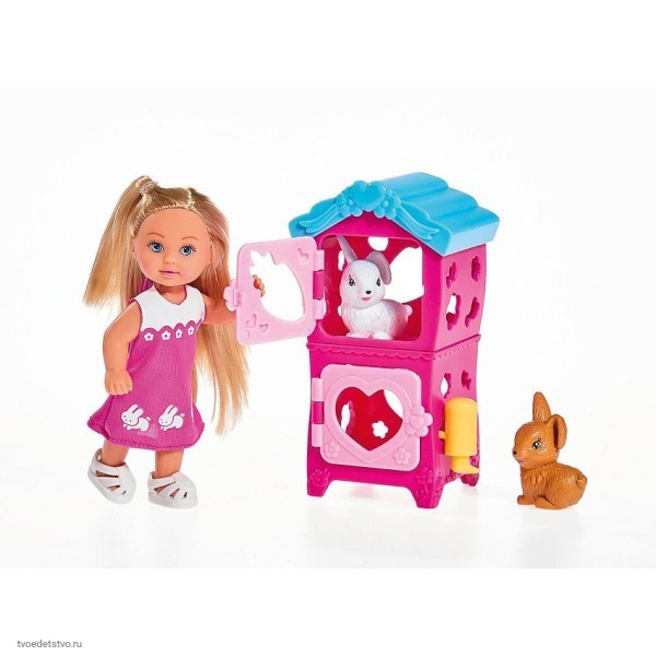 Малышка по имени Еви не только очаровательна, но и очень добра. Она обожает животных, но больше всего любит кроликов, за которыми тщательно ухаживает, кормит их морковкой и чистит им клетки. Все это девочки смогут разыграть с помощью миниатюрной куколки и игровых аксессуаров из этого тематического набора. Особенности: - Девочкам сразу понравится эта очаровательная куколка по имени Еви, которая выглядит как маленькая девочка с выразительными чертами лица. - У игрушки длинные светлые волосы, которые можно заплетать в хвостики или косички, а также придумывать новые прически. - Ручки и ножки Еви можно двигать, придавая ей во время игр различные позы. - Малышка одета в яркое розовое платьице с цветочками и декоративными кроликами на подоле. - Эти животные не просто так изображены на наряде Еви, так как она занимается их разведением. - В комплекте с куклой представлены 2 миниатюрные фигурки кроликов, которые сидят в своих клетках, а кормить их можно из миски реалистичными морковками. - Таким образом помимо главной героини игры, девочки получают еще и декорации, а также других персонажей. - Увлекательные сюжетные развлечения с участием Еви и ее питомцев благотворно скажутся на фантазии детей и их воображении. - Куколка и аксессуары выполнены из пластика повышенной прочности, который не деформируется от ударов и падений. - Игрушки окрашены в насыщенные яркие оттенки нетоксичными, стойкими к истиранию красителями.