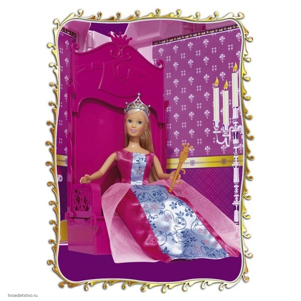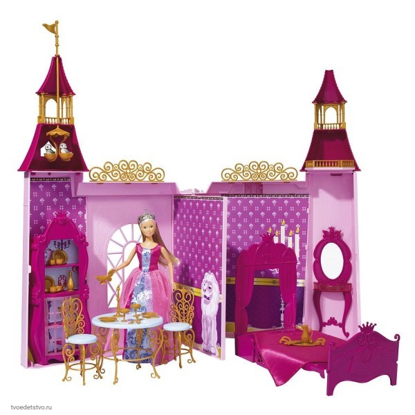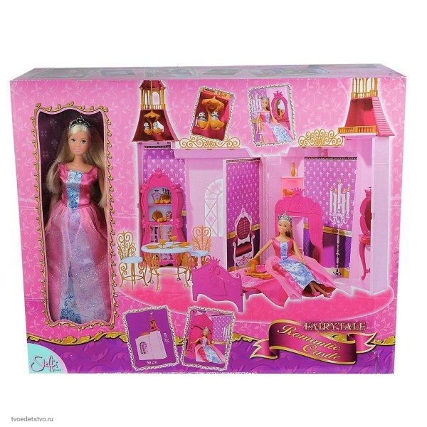 Каждая кукла мечтает жить в таком шикарном замке, который есть у куклы Штеффи! Это очень красочный, детально проработанный набор, в который входит не только сама кукла, но и ее замок, а также множество аксессуаров для игры. Замок создан в розовом, малиновом, лиловом цвете с вкраплениями золотого. В наборе есть резные стульчики и стол, королевская кровать, шкафчик, туалетный столик, посудка. В высоких башнях можно рассмотреть гнездо птичек, балкончики. Сама кукла Штеффи одета в пышное бальное платье, на ее голове корона. Длинные светлые волосы куклы можно расчесывать. Замок можно складывать и раскладывать, как книгу. Специальная перегородка делит пространство на 2 комнаты. Комплектация: 1 кукла, замок, аксессуары. Высота куклы: 29 см. Высота замка: 67 см. Размер замка в сложенном виде: 67 х 38 см.
