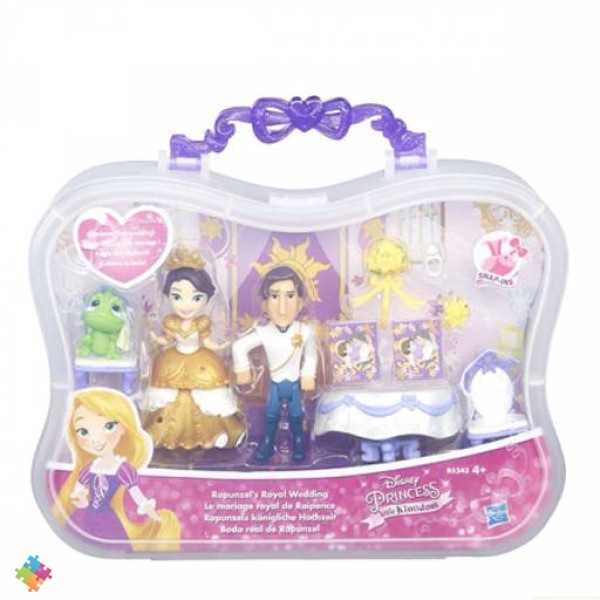 В наборе с принцессой Авророй: принцесса, 3 феи, кроватка принцессы, прикроватная тумбочка, посуда, украшения. В наборе Рапунцель и Флин: Рапунцель, Флин, Паскаль, 2 стула, стол, свадебные приглашения, букет невесты, украшения.