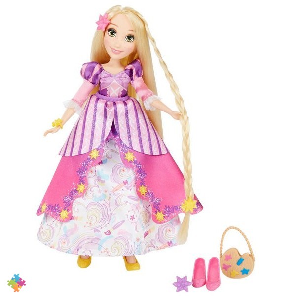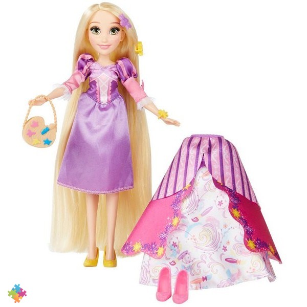 Рапунцель. Вынужденная всю жизнь просидеть в заточении, длинноволосая красавица одевается достаточно скромно. Однако она готова встретить прекрасного принца - для этого у нее есть две сменные юбки, которые превратят ее повседневное платье в пышное и элегантное! А две пары туфелек, сумочка и дополнительные аксессуары дополнят ее образ.