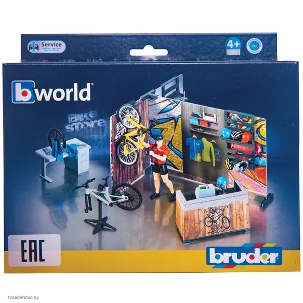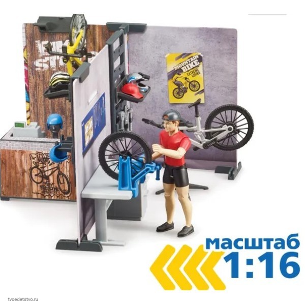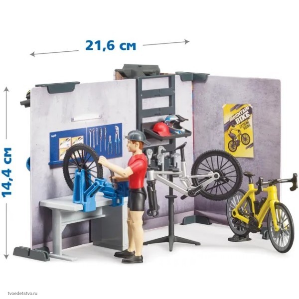 Набор велосипедный магазин от Bruder имитирует зону покупки велосипедов и отдельную зону для ремонта.