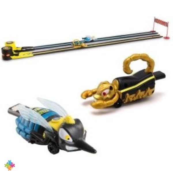 Комплект: 2 машинки, 2 пусковых механизма, сборный трек 12 деталей, 2 листа наклеек, финишная лента