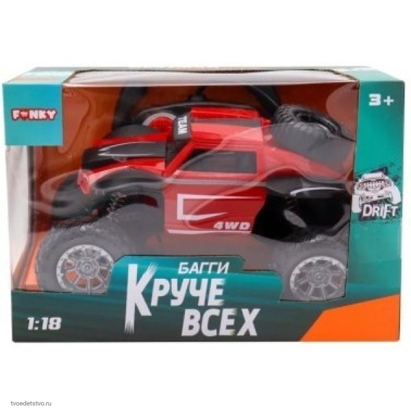 Машинка Багги "Круче всех" с пультом дистанционного управления на батарейках. Машинка выполнена в масштабе 1:18. Едет быстро, поворачивает отлично. Игрушка со светящимися фарами осуществляет движение во всех направлениях: вперёд, назад, повороты вправо и влево. Машинка обладает высокой проходимостью по разным поверхностям благодаря высоким и большим колёсам на прочной резине. Машинка с яркой расцветкой может разгоняться до высоких скоростей и выполнять интересные трюки. Красивый внешний вид. Батарейки в комплект не входят. Вес: 430г. Размер машинки: 20х12х13см. Микс из 4-х видов. Размер индивидуальной коробки с окном: 22х15х13,5см.