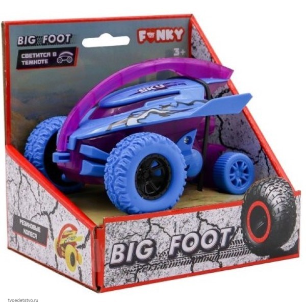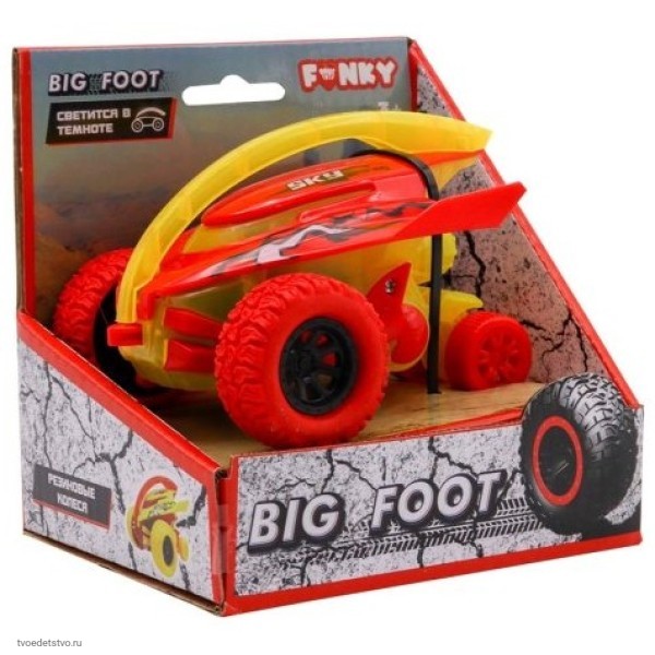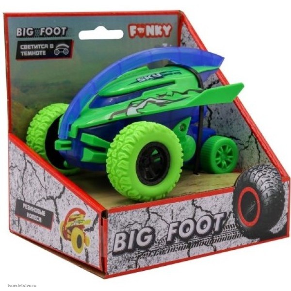 Представляем вам машинку BigFoot от Funky Toys, которая может светиться в темноте. Машина имеет яркий дизайн с красочным граффити на кузове, что делает её привлекательной для ребёнка любого возраста. Она оснащена фрикционным механизмом, который позволяет ей двигаться на небольшие расстояния после толчка.