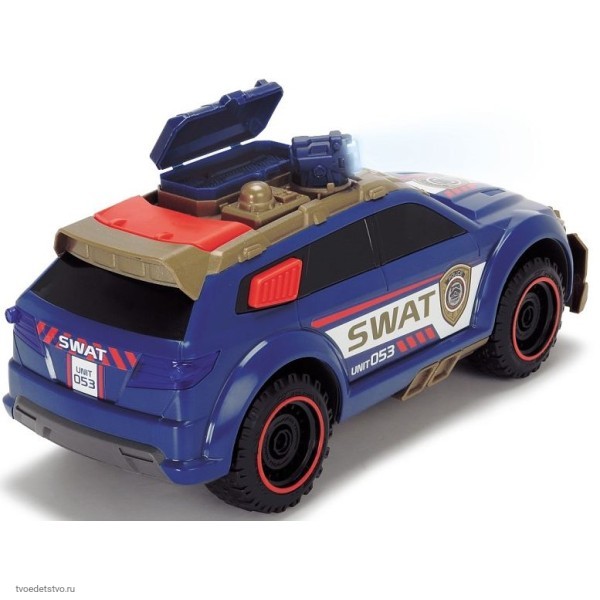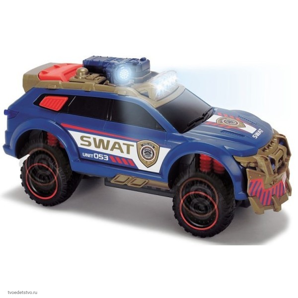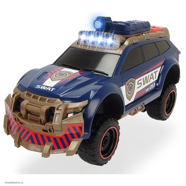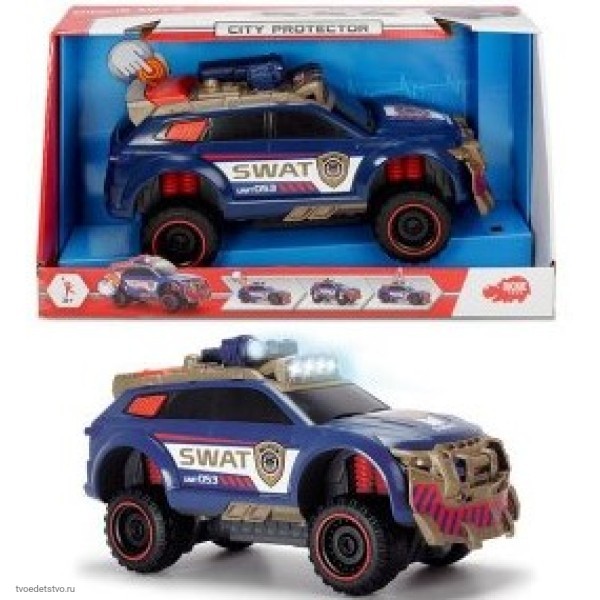 Впечатляюще мощный полицейский внедорожник "Защитник города". Размер машины – 33 см. У внедорожника эффектный обвес, а через колесные арки видны массивные пружины; Высоту подвески можно отрегулировать; На крыше джипа располагаются мигалка и прожектор, активация которых производится по нажатию на соответствующую кнопку; Машина оснащена звуковыми эффектами. Питание: 2 батарейки 1,5V R6, в комплекте.