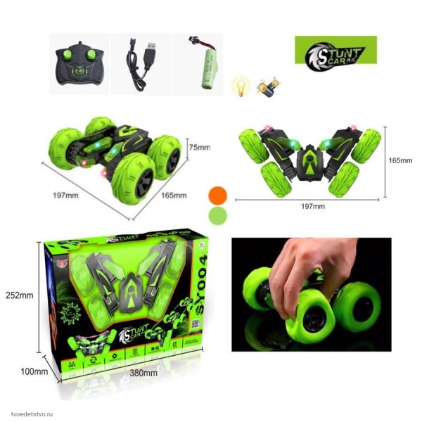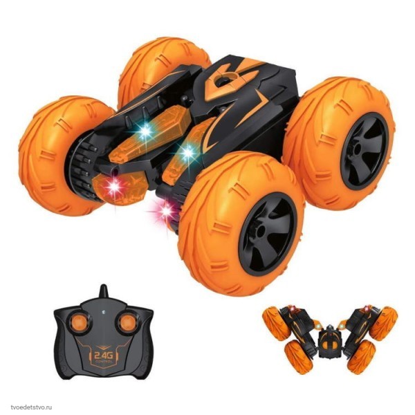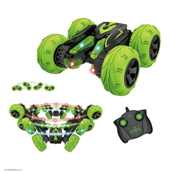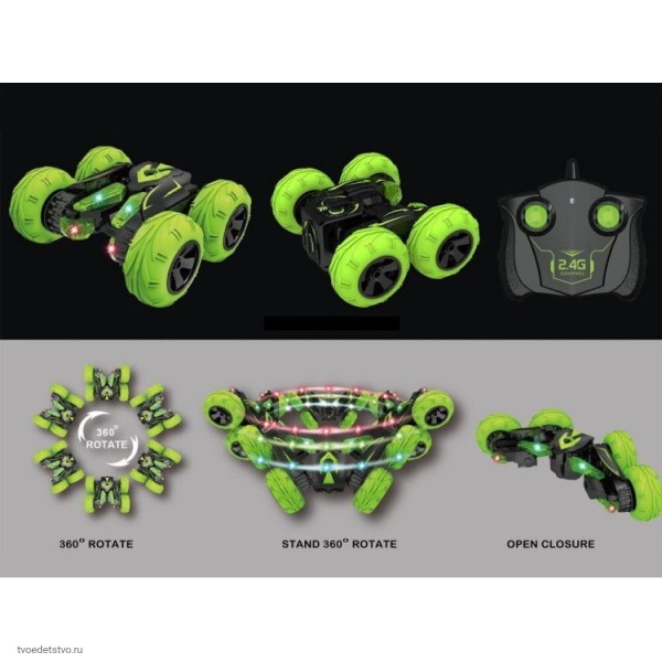 Трюковый автомобиль-перевёртыш осуществляет движение вперёд и назад, повороты направо и налево, способен во время движения вращаться на 360 градусов в разных плоскостях, трансформироваться, переворачиваться как акробат. Надувные шины обеспечивают отличную сбалансированность автомобилю, что позволяет легко им управлять. Такие шины дают автомобилю улучшенную амортизацию, он способен преодолевать любые препятствия, ездить по грунтовой дороге, скользким поверхностям, падать с высоты и продолжать движение. Машинка оснащена яркими цветными светодиодами. В темноте включенная подсветка превращает игру с автомобилем в эффектное световое