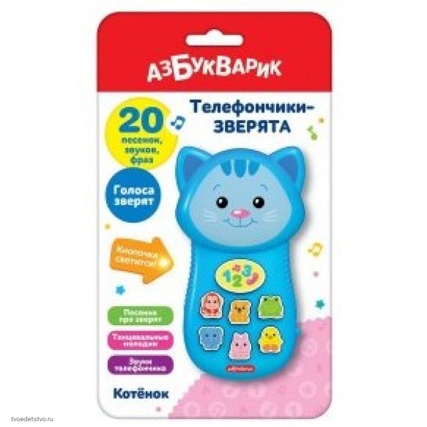 Музыкальный телефончик для малыша в виде милого котенка! Вместе с ним ребенок сможет позвонить зверятам: обезьянке и щенку, слоненку и лягушке, зайке и утенку. Для этого не нужно набирать номер – достаточно нажать на фигурную кнопочку с изображением животного, вот такое волшебство!