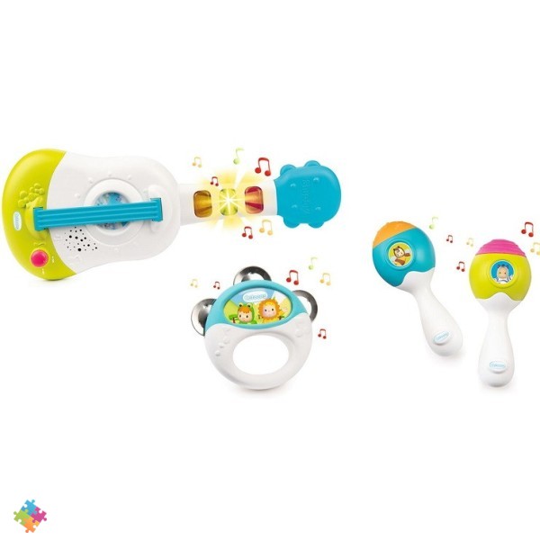 - Световые эффекты и звуковое сопровождение игрушки (укулеле) поднимут малышу настроение.