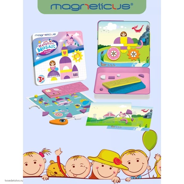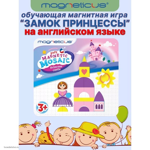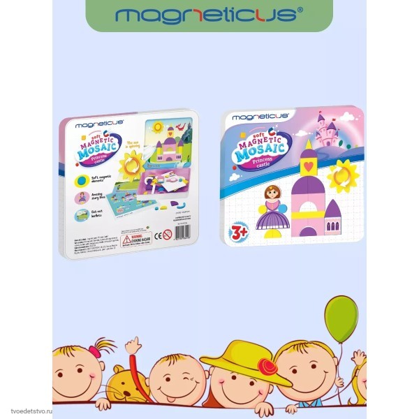 Magneticus мозаика магнитная "Замок"- это игры на английском для детей, которые одновременно и развлекательные и обучающие. Все надписи на упаковке, название картинок в буклете на английском языке! Картинки-сюжеты помогут полностью погрузить ребенка в изучаемую тему, а вращающиеся элементы сделают процесс сборки занимательным и увлекательным. Игра магнитная мозаика для девочек способствует развитию воображения, мелкой моторики, внимательности, а так же воспитывает в ребенке усидчивость. Их отлично использовать как игры в дорогу для детей. Магнитная игра для детей содержит: 47 мягких магнитных элементов; 3 вращающихся элемента; 4 красочных фона для сборки картинок; набор тематических наклеек; металлическая коробка, которая является игровым полем и местом где хранится магнитная мозаика. Материалы из которых состоят развивающие игры для детей 3-4лет: полимерные материалы, металл, бумага, ЭВА. Эта мозаика детская не рекомендуется детям до 3-х лет. Содержит мелкие детали. Подарки для детей развивающие подойдут в детский сад, в дорогу и для изучения английского языка.