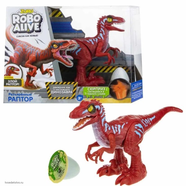 Игровой набор RoboAlive - Робо-раптор красный и слайм. Замечательный подарок, для детей! Раптор красного цвета, выглядит очень реалистично, с ним будет весело играть. Маленький живой динозаврик, будет с вашим малышом. Особенности: быстро бегает, клацает челюстями, яркий окрас, светоотражающие глаза, слайм-сюрприз в наборе, реалистичные движения. Питание: 2 батарейки типа AA (не входят в комплект).