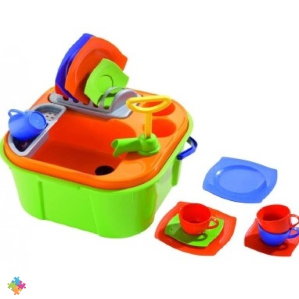 Игровой набор, фирмы Полесье, Мини-посудомойка, для девочек. Игрушечная посудомойка зелено-оранжевого цвета понравится каждой девочке. В комплект входит детская посуда. Изготовлена из прочного и безопасного для здоровья пластика. Поможет ребенку придумать множество игр, почувствовать себя настоящей хозяйкой и привить любовь к труду. Основой посудомойки выступает глубокое пластиковое ведро с ручкой. На него устанавливается столешница с мойкой и сушилки для посуды, кран. Завершением крана является мини — насос. Когда ребенок тянет помпу вверх — вниз из крана льется вода. Чтобы разнообразить игру и сделать сюжет еще более похожим на настоящие «взрослые» дела в емкость посудомойки нужно налить воду. Через помпу она перекачивается в мойку. А чтобы вода не выливалась обратно, сливное отверстие мойки можно заткнуть пластиковой пробкой (поставляется в комплекте). Набор посуды рассчитан на четырех гостей и состоит из блюдец, чашек и тарелок. Все принадлежности легко складываются в контейнер (ведерко) для переноски или хранения. Набор обучит ребенка помогать по хозяйству, наводить чистоту и поддерживать порядок.