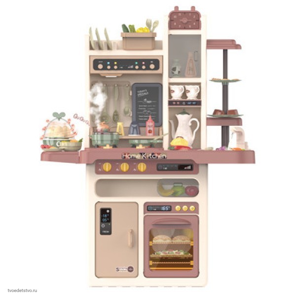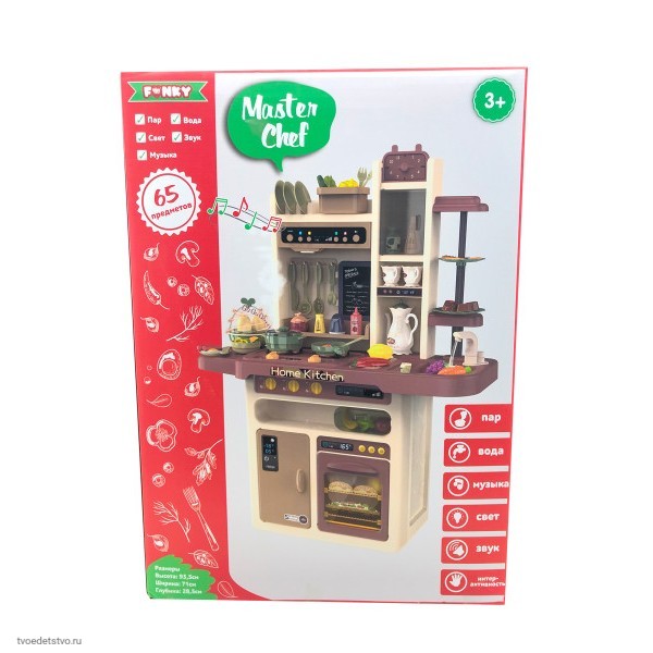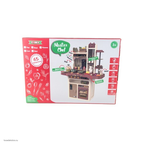 Игровая кухня Master Chef из 65-ти предметов. Большая кухня с функцией света, звука, подачи пара и воды порадует вашего маленького повара. Особенностями кухни являются две конфорки плиты с подсветкой и звуками приготовления пищи. Если добавить внутрь конфорки небольшое количество воды, то пойдет пар. Кран мойки оборудован системой подачи воды.