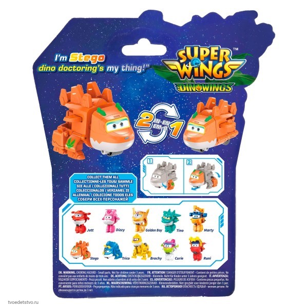 Стего - мощный и добрый герой, который всегда приходит на помощь друзьям! Игрушка выполнена из прочного безопасного пластика и качественных красок, отличается ярким, запоминающимся дизайном. Удобный механизм трансформации — 2 режима: самолёт и динозавр — делает игру разнообразной и развивает моторику. Ребенок сможет играть с самолетиком, разгонять его, создавая впечатляющие моменты взлета и посадки, как на настоящей взлетно-посадочной полосе. Теперь ваш ребенок может создавать свои увлекательные истории и приключения с этим чудесным роботом. Это не только веселая игрушка, но и мощный инструмент для развития вашего малыша. Она стимулирует воображение, развивает координацию движений и творческое мышление. Позвольте вашему ребенку почувствовать себя героем мультфильма, воплощая свои собственные истории и приключения с этим захватывающим роботом-трансформером. Не предназначено для детей младше 3-х лет!