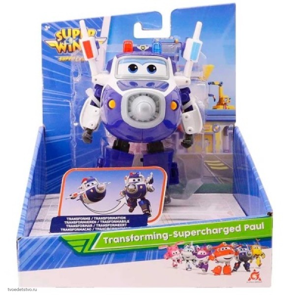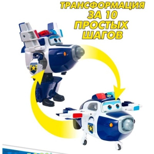 Робот Супер Пол Трансформер Super Wings EU740303. Суперзаряженный Пол - один из главных героев команды Супер Крыльев! В 4-м сезоне мультфильма Супер Крылья - Подзарядка полицейские навыки Пола, которые он всегда использовал для защиты мира, усиливаются, поскольку он получает два новых мощных инструмента: многофункциональный щит и мощную дубинку. Трансформируй Пола из самолета в робота всего за 10 простых шагов и почувствуй себя членом команды Супер Крыльев! Трансформация из робота в самолет очень простая.