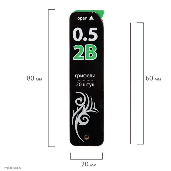 Грифели имеют твердость 2В. Длина изделия – 60 мм, а диаметр – 0,5 мм. Цвет – серый.