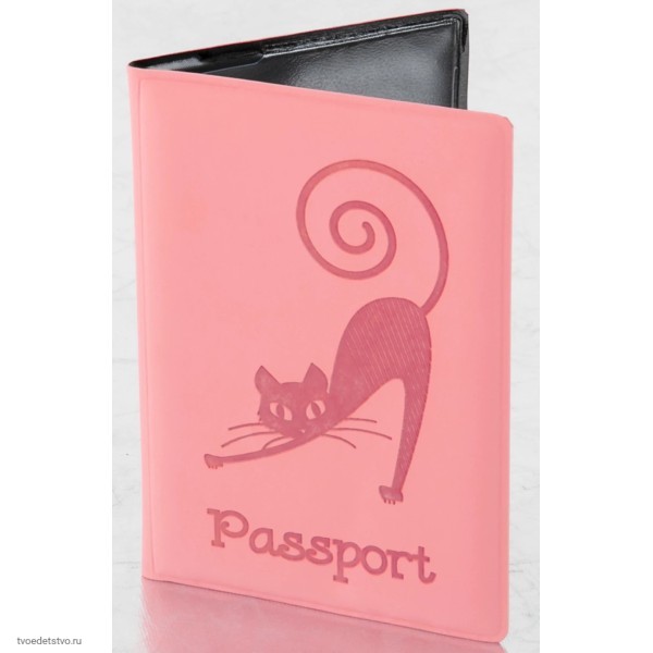 Модель выполнена из мягкого полиуретана яркого персикового цвета, украшена изящной кошкой и тисненой надписью "Паспорт". На внутреннем развороте расположены два кармана из прозрачного пластика. Благодаря компактным размерам 97х138 мм удобно всегда носить с собой.