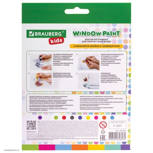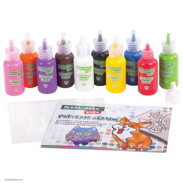 В набор витражных красок BRAUBERG KIDS входят 10 ярких непрозрачных красок (красный, синий, зеленый, желтый, черный, оранжевый) в тубах по 20 мл, книга с шаблонами для рисования и пленка для предварительного создания аппликаций из красок. Готовые самоклеящиеся аппликации можно многократно переносить на любые гладкие поверхности.
