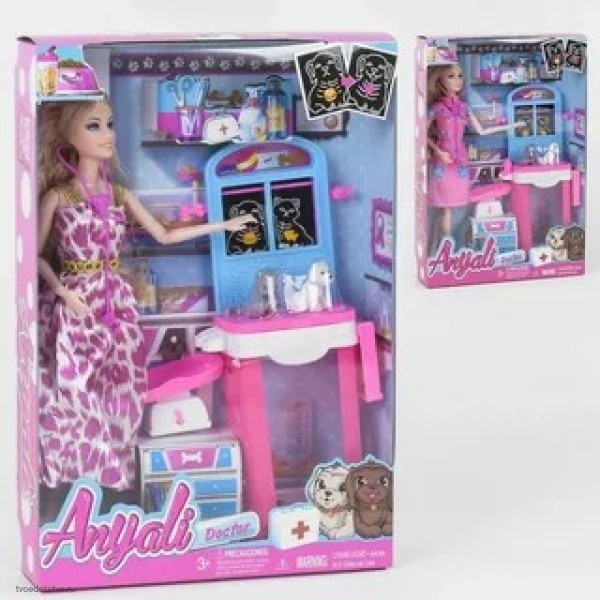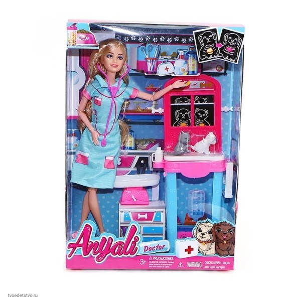 Набор с куклой великолепно демонстрирует небольшой кабинет врача ветеринара. Стойка для обследования оснащена мониторами, которые показывают состояние сердца и желудка собачки и кошечки, также в конструкции есть подстаканники и складная полочка, дополнительным аксессуаром выступают весы, стрелку которых можно двигать. Кукла в наборе идет с стетоскопом. У нее приятная и располагающая внешность. Длинные, густые волосы и белоснежная улыбка.