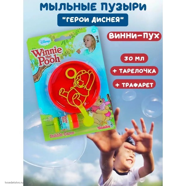 Мыльные пузыри детские Винни-Пух радуют как детей, так и родителей. В комплект входят небольшая баночка с мыльным раствором (30 мл), тарелочка, в которую необходимо макать форму для пузырей, трафарет на небольшой ручке для выдувания шариков. Игрушка создаст пузыри и украсит любое торжество детские дни рождения, свадьбы и просто поднимет настроение девочек и мальчиков. Мыльные пузыри — это развлечение для создания радостного настроения. Каждый день мыльные удовольствия дома и на природе. Пузыри мыльные детские для веселого времяпрепровождения детей и взрослых! Многие детишки любят наблюдать, как выпускаемые ими мыльные пузыри разлетаются в разные стороны, подгоняемые ветром. Мыльный раствор нетоксичен, он не вызывает у детей раздражение и аллергию.