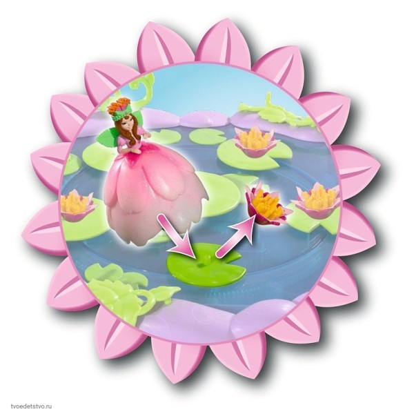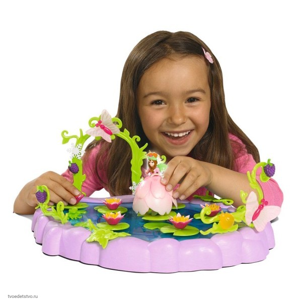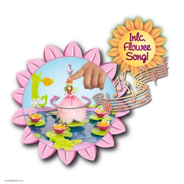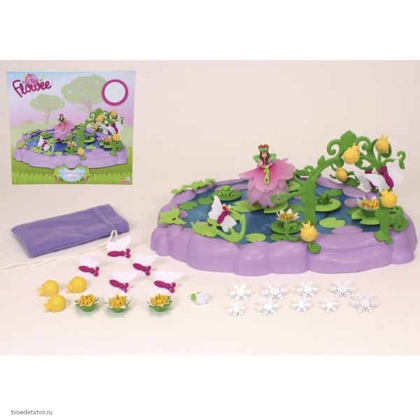 Игровой набор Simba Flowee - музыкальное озеро с вращающейся платформой и фигуркой феи. Этот волшебный набор подарит вашей маленькой принцессе массу положительных эмоций во время игры и превосходно подойдет в качестве подарка любой девочке! Феи Flowee обожают собираться на Музыкальном озере и кружиться на кувшинках в волшебном танце, во время которого будет играть музыка. Платформа приходит в движение при проворачивании любого аксессуара, установленного на листочек на платформе. Музыка начинает играть при установке феи на центральный листочек. В набор входит: озеро с вращающейся платформой; фигурка феи Викки; колечко для девочки; 25 аксессуаров для украшения озера ( растения, ягоды, жучки, бабочки, снежинки, лягушки); мешочек для хранения аксессуаров; 3 коллекционные карточки + 1 голографическая. Размеры: озеро - 17 см; фигурка феи - 8,8 см. Для работы необходимы батарейки типа 3 х AG3 / LR41 (миниатюрные), в комплект не входят.