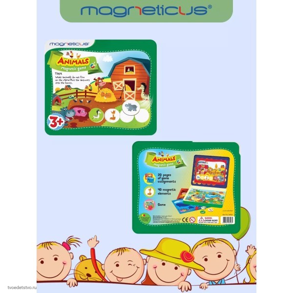 Magneticus мозаика магнитная игра «Животные» - это игры на английском для детей. Все надписи на упаковке, название картинок в буклете на английском языке! Настольные игры для детей магнитные это не просто интересно, но еще и удобно. Развивающие игрушки для малышей произведены в России из безопасных материалов и разработаны совместно с детскими психологами и учителями. Магнитная игра для малышей от бренда Magneticus это металлическая коробка, которая служит игровыми полем и используется как кейс, где хранится магнитная мозаика . Яркие картинки и магнитные элементы помогут развить фантазию, узнать новое о животных, придумать свои магнитные настольные игры. Игра на магнитах удобна для путешествий и в дорогу, ведь развивающие игры помогают детям с интересом знакомится с окружающим миром. Игра настольная ходилка, интересные игры и дополнительные 20 ярких страниц с заданиями – это все содержат магнитные развивающие игры 2 года и старше. В коллекции бренда: магнитные мозайки, магнитные настольные игры, игры в дорогу в удобных металлических кейсах, развивающий конструктор, обучающие магнитные наборы с заданиями.