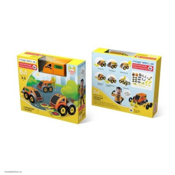 Конструктор Magneticus магнитный 6-в-1 Городская техника. Магнитные кубики Городская техника Magneticus позволят ребёнку узнать, какая техника помогает наводить порядок на улицах города. Снегоуборочная машина, поливальная машина и даже мусоровоз сделают игру интересной и увлекательной. Из магнитных кубиков и дополнительных деталей можно легко собрать 6 разных машинок. Конструкция колёсной базы и магнитное соединение позволяют быстро превратить одну машинку в другую.