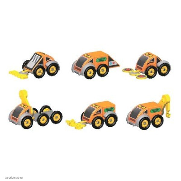 Состав: В наборе пластиковые кубики с наклейками, пластиковые запчасти, элементы из EVA; листовка с вариантами сборки моделей; набор дополнительных наклеек; инструкция по поклейке наклеек. Можно собрать 6 разных видов техники.