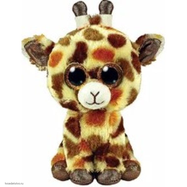 Мягкая игрушка TY Beanie Boos Жираф STILTS с блестящими глазами с золотыми пуговицами и черной строчкой для носа и рта на белой мордочке.