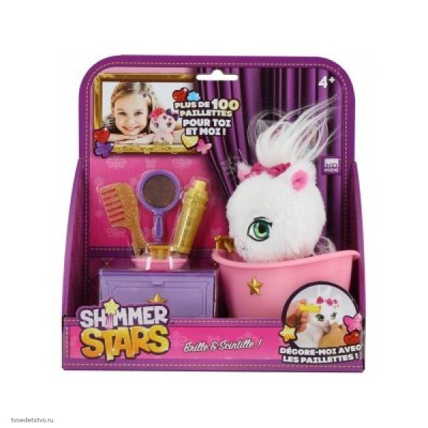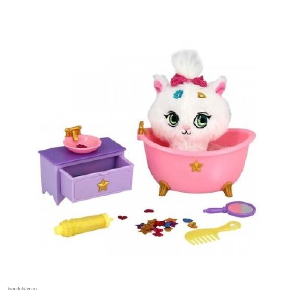 - В комплекте: плюшевый котенок 13 см, шиммерайзер (аксессуар для нанесения и хранения блесток), 100+ блесток, расческа, ванна, комод, аксессуары.