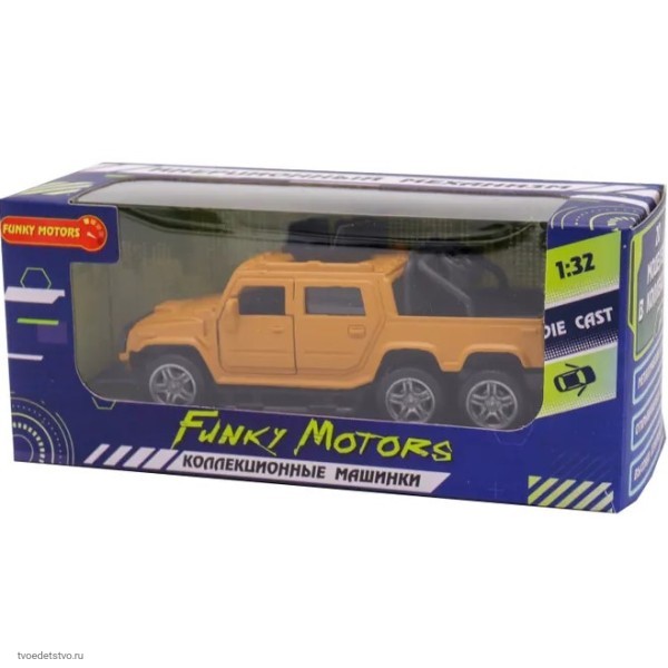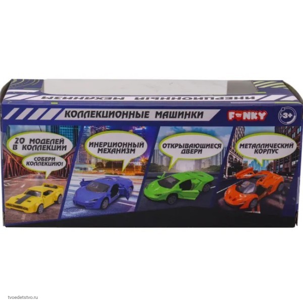 Машинка металлическая от «Funky toys» - отличный выбор для любителей машинок и скорости. Эти машинки точные копии модели машинок из жизни, они отлично дополнят игрушечный гараж. Благодаря встроенному инерционному механизму, гоночная машинка может самостоятельно передвигаться от небольшого толчка рукой. У игрушки для мальчиков резиновые шины и отрывающиеся двери. Запустите игрушечный транспорт в гоночное испытание и соревнуйтесь с друзьями! Машинка детская надолго привлечет внимание вашего ребенка, ведь с ней можно придумать интересные и захватывающие игры и сюжеты, играть с друзьями. Машинки детские развивают воображение, координацию, мелкую моторику, сноровку и ловкость. Инерционная машинка идеальна не только для игр маленьких автолюбителей, но и отличный подарок для мужчины - машина приятно удивит коллекционеров и займет достойное место на полке в коллекции. Машина игрушка - это идеальный подарок ребенку на любой праздник: новый год, день рождения, рождество, именины или просто так. Детская машинка изготовлена из высококачественных, ударопрочных материалов, имеет цельнолитой корпус и детализированный салон. Так как игрушка для мальчика ударопрочная, ее можно брать с собой в детский сад, на прогулки и в путешествия. Коллекционные машинки масштабом 1:32. В коллекции машинок представлены: гоночные машинки, внедорожники, легковые автомобили, ретро машинки и спецтехника. Машинка игрушка - отличный подарок для мальчика, улучшите свою коллекцию мини автомобилей и насладитесь восхитительной игрушкой от Funky Toys!