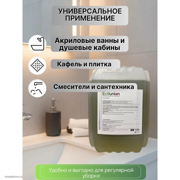 Средство работает как чистящее от известкового налета и помогает поддерживать чистоту без интенсивного трения. Оно эффективно удаляет загрязнения от известкового налета, действует как антикальций для сантехники и подходит для очистки смесителей, плитки, акриловых ванн, душевых и кафеля. Продукт можно использовать как средство от мыльного налета на кафеле и как антиналет для душевой кабины, включая стеклянные и пластиковые поверхности.