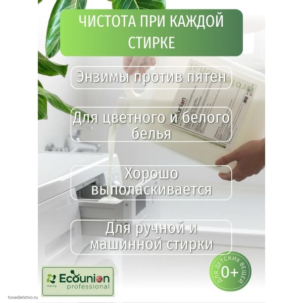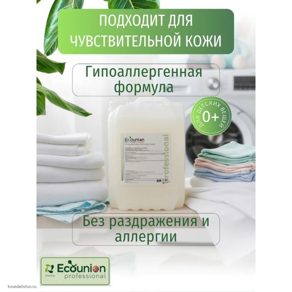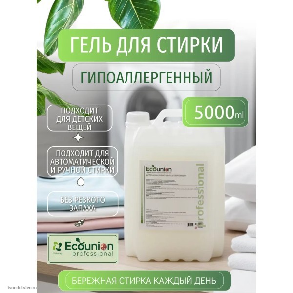 Гипоаллергенный гель для стирки 5 литров Ecounion — универсальное средство для стирки одежды всей семьи. Жидкая формула подходит для регулярного использования и может применяться как жидкий порошок для стирки в стиральных машинах автомат и при ручной стирке. Средство относится к категории качественной бытовой химии для дома и профессионального использования.