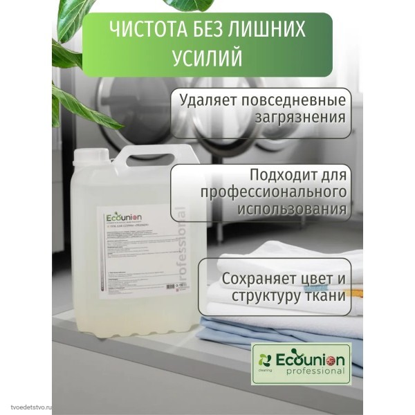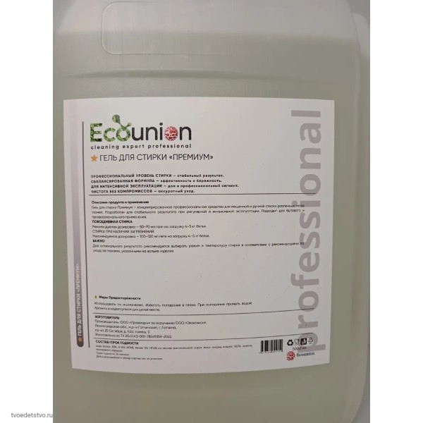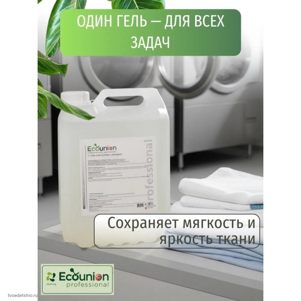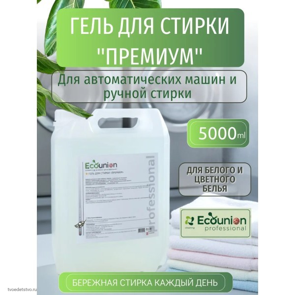 Премиальный гель для стирки 5 литров Ecounion — эффективное и удобное средство для стирки для дома и профессионального использования. Современная жидкая формула легко растворяется в воде и равномерно распределяется по ткани, поэтому гель работает как жидкий порошок и подходит для автоматических стиральных машин и ручной стирки. Формат гель для стирки 5л автомат делает средство экономичным и практичным для регулярного применения.