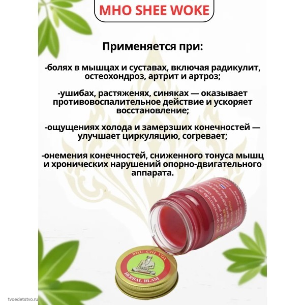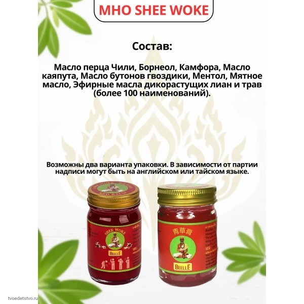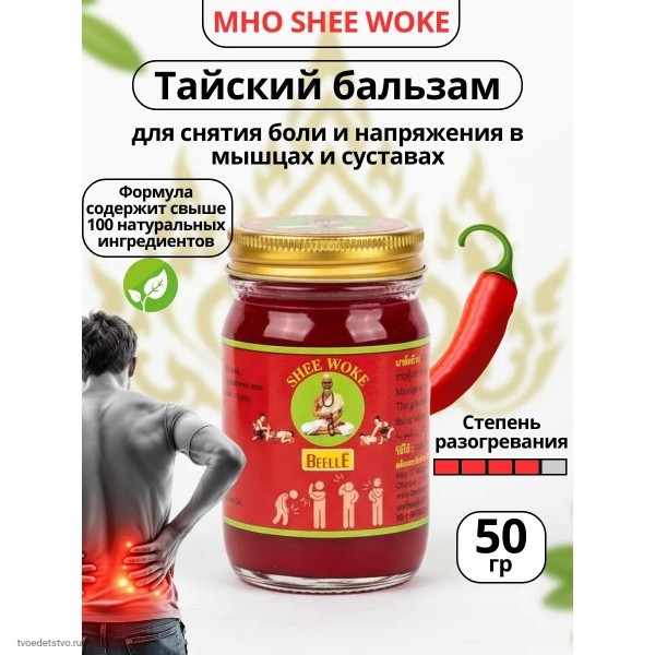 Красный массажный бальзам Beelle (Mho Shee Woke), 50 г — мощный разогревающий бальзам из Таиланда, созданный для снятия боли в мышцах и суставах. Средство быстро помогает при растяжениях, ушибах, мышечном напряжении, нагрузках после спорта и простудных болях в теле.
