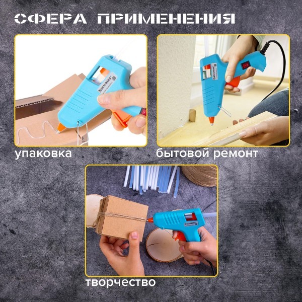 С его помощью можно склеить дерево, пластик, резину, кожу, стекло, металл, ткань, пенопласт, керамику, картон, бумагу, цветы и прочие материалы. Заправляется специальным клеевым стержнем диаметром 7 мм. Клеевой пистолет мощностью 15 Вт работает от сети и дополнительно имеет кнопку отключения, которая позволяет не выключать пистолет из розетки во время паузы в работе. Производительность 6 г/мин обеспечивает непрерывную подачу клея.