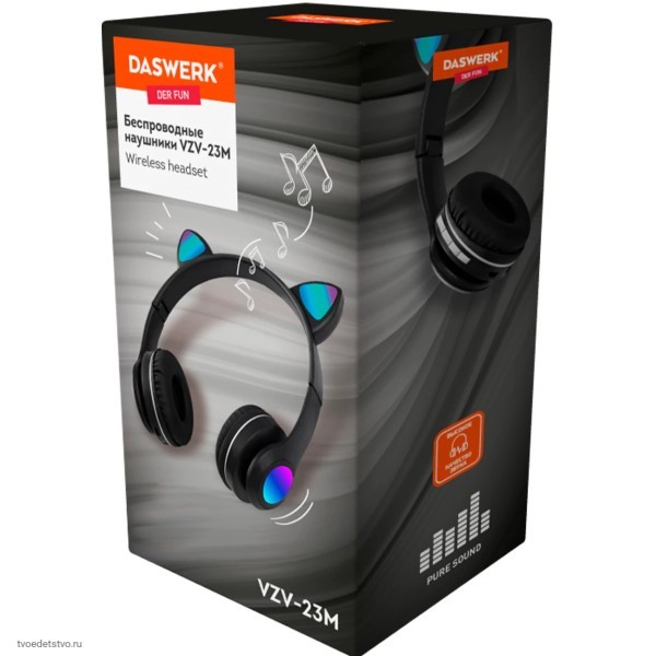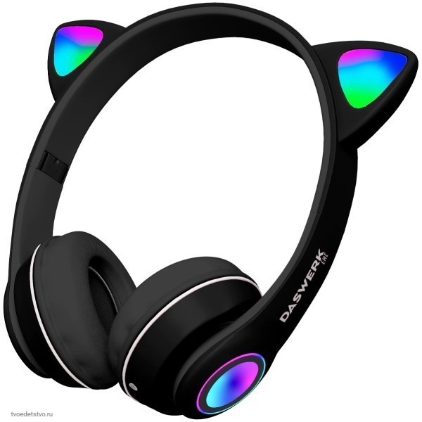 Беспроводные наушники DASWERK с кошачьими ушками и подсветкой — это яркая и надёжная гарнитура. Слушай музыку, аудиокниги, играй!