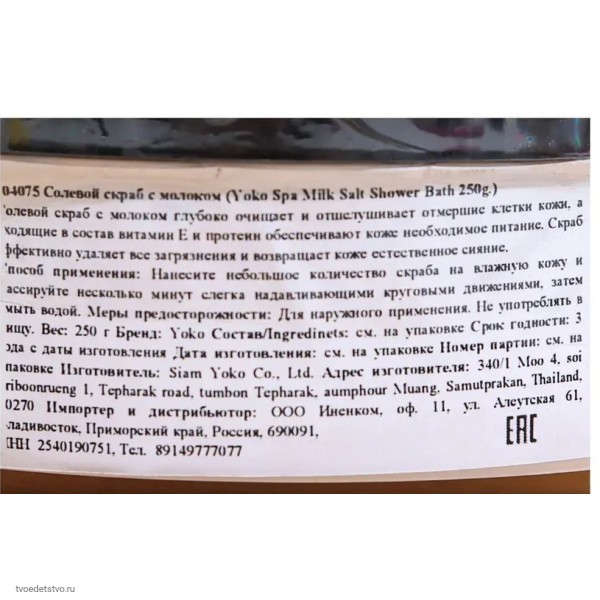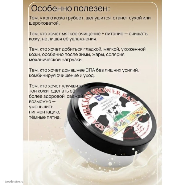 В составе: витамин E, молочный протеин, олива и соль. Витамин E поддерживает молодость кожи, молочный протеин повышает эластичность, олива обеспечивает питание и увлажнение, а солевой компонент стимулирует микроциркуляцию. Такой уход особенно эффективен в душе, в ванны или в баню - скрабы работают лучше на распаренной коже.