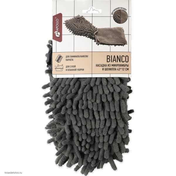 Насадка для швабры Bianco из микрофибры и шенилла от бренда APOLLO – аксессуар для поддержания чистоты пола. Изделие предназначено для сухой и влажной уборки помещений и подходит для разных видов напольных покрытий (ламинат, паркет, кафель, линолеум). Сменная насадка устанавливается на основание швабры (швабру необходимо приобретать отдельно). Насадка имеет две моющие поверхности микрофибра + шенилл, для быстрой и качественной уборки. Размер изделия: 43х12см. Материал изготовления: микрофибра(100% полиэстер), шенилл (100% полиэстер).