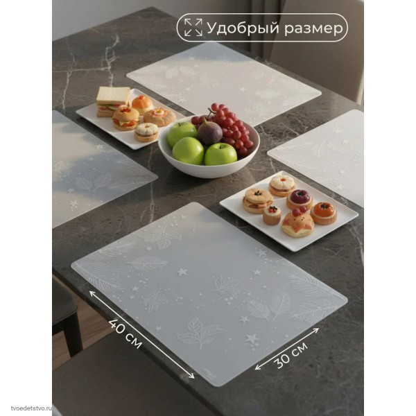 Прямоугольные салфетки легко моются, не теряют форму и цвет со временем. Коврики противоскользящие и термостойкие, обеспечивают удобство и аккуратность при сервировке стола.