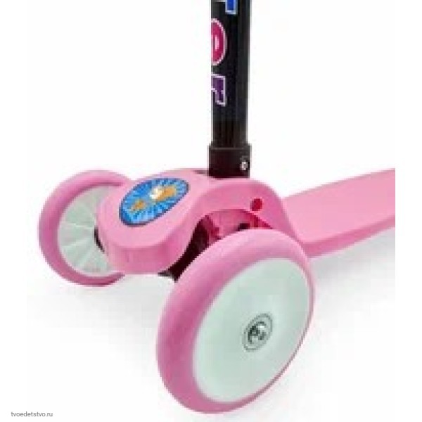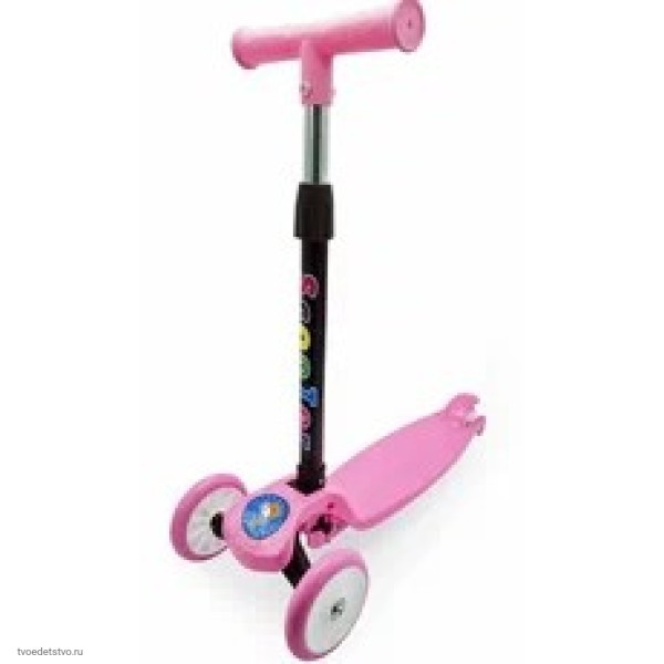 Детский трехколесный самокат. Ручку самоката можно регулировать по высоте. Максимальная высота ручки 75 см. Поворот у самоката происходит при наклоне руля. Оснащён съёмной ручкой для удобной транспортировки. Он изготовлен из высококачественных материалов, отлично способствует развитию опорно-двигательного аппарата ребенка, его координации движения и навыкам балансировки.