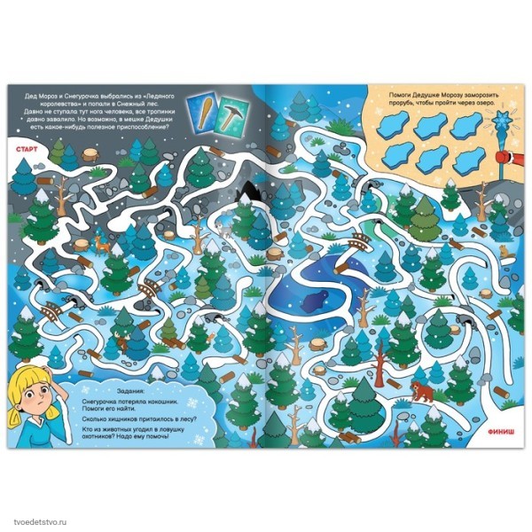 - Внутри ребёнок найдёт много интересных заданий. Ему предстоит сыграть в непростую бродилку, найти пропавший кокошник Снегурочки и выполнить другие увлекательные миссии.