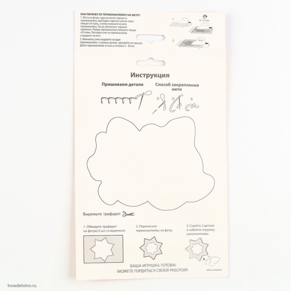 Подготовьте инструменты и рабочее место. Обведите трафарет на фетре и вырежьте две детали. Переведите термонаклейку на фетр ( в этом вам поможет подробная инструкция), сшейте и набейте игрушку наполнителем.