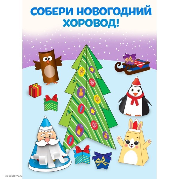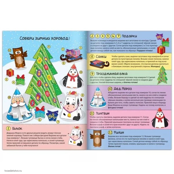 - 20 страниц с готовыми шаблонами для вырезания и сборки 12 праздничных поделок, включая ёлочку, Деда Мороза, пингвина и другие символы Нового года.