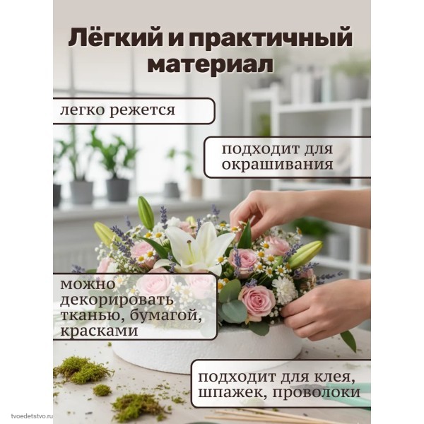 Пенопласт совместим с акриловыми и гуашевыми красками, клеем ПВА, лаком, термоклеем, клеевым пистолетом и двусторонним скотчем, что делает его универсальной заготовкой для любых проектов. Комплектность в штуках позволяет сразу использовать несколько кругов для декора и творчества.