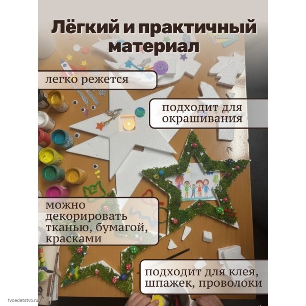 Материал — качественный пенопласт с четкими и аккуратными краями без заусенцев и сколов. Заготовки для декора готовы к работе сразу после вскрытия упаковки. Детали легко склеиваются любым клеем для пенопласта: ПВА, Титан, Дракон, термоклей. При желании форму можно загрунтовать, раскрасить акриловыми красками, покрыть блестками или дополнить георгиевской лентой, создавая уникальный элемент декора к 9 мая.