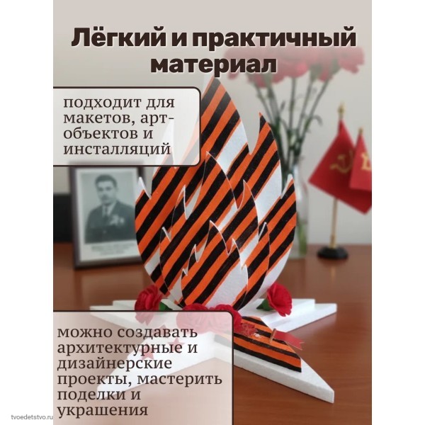 Благодаря легкому весу композиция устойчива и при необходимости крепится на двусторонний скотч или клеевые подушки. Наборы для творчества из пенопласта помогают детям и взрослым создать памятный символ ко Дню Победы своими руками.